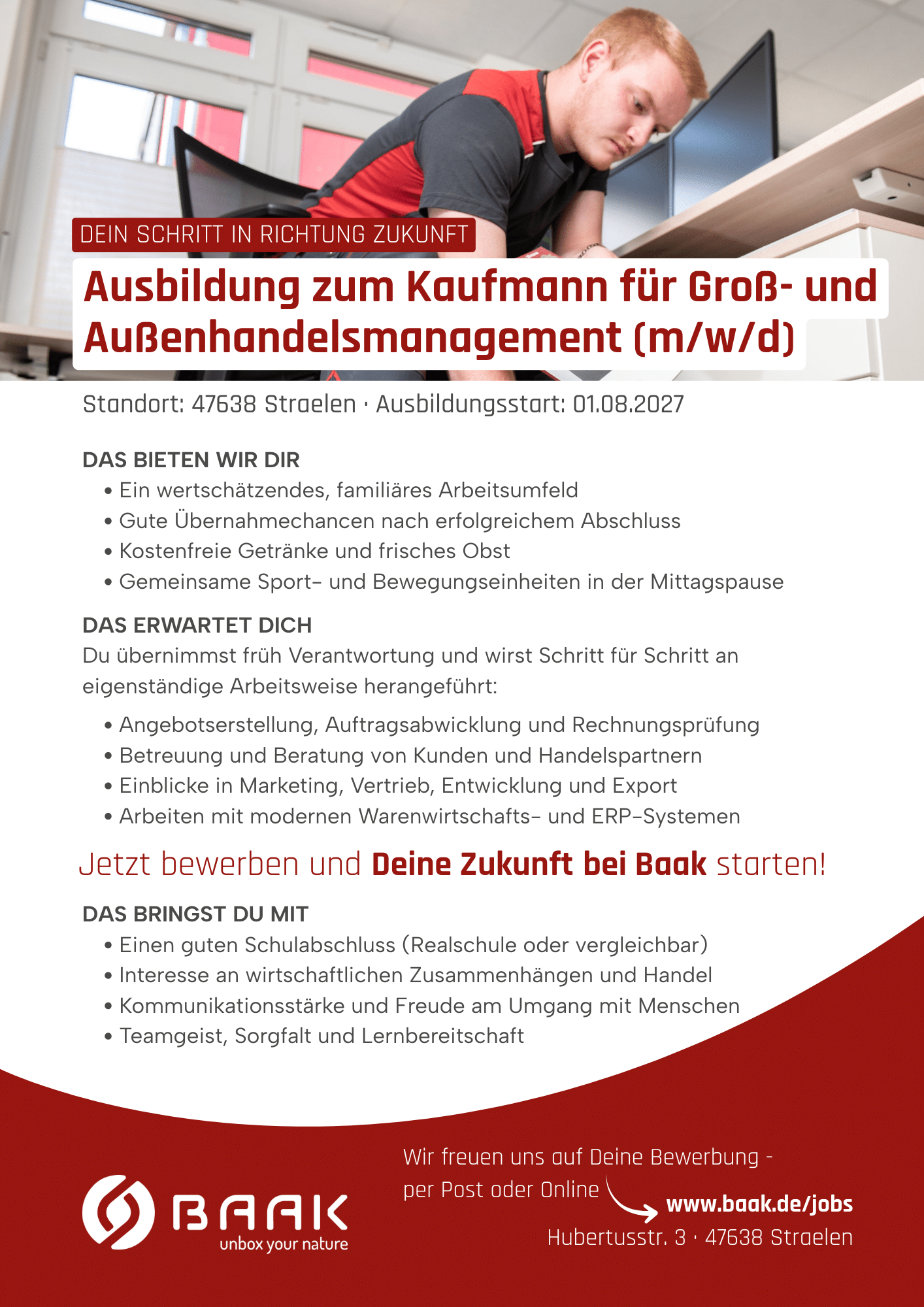 Damit unsere Produkte erfolgreich im Markt bestehen, braucht es starke kaufmännische Prozesse und partnerschaftliche Kundenbeziehungen. Starte ab 01.08.2027 Deine Ausbildung zum Kaufmann für Groß- und Außenhandelsmanagement (m/w/d).